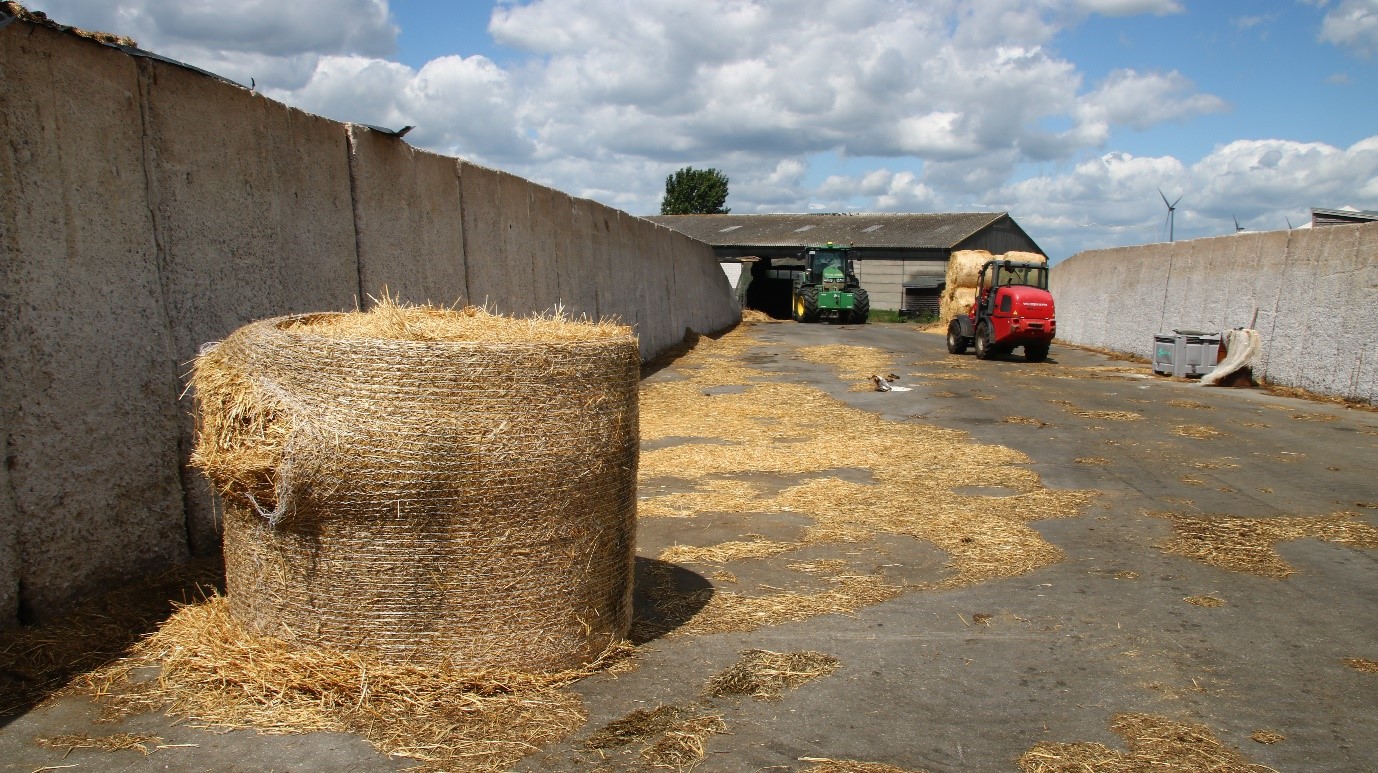 走進農場長75公尺、寬25公尺、最高達5公尺的穀物儲存區,共有三座穀倉,「可保存1萬2000公噸的牧草,所需種植面積約320公頃,供一整年使用。」