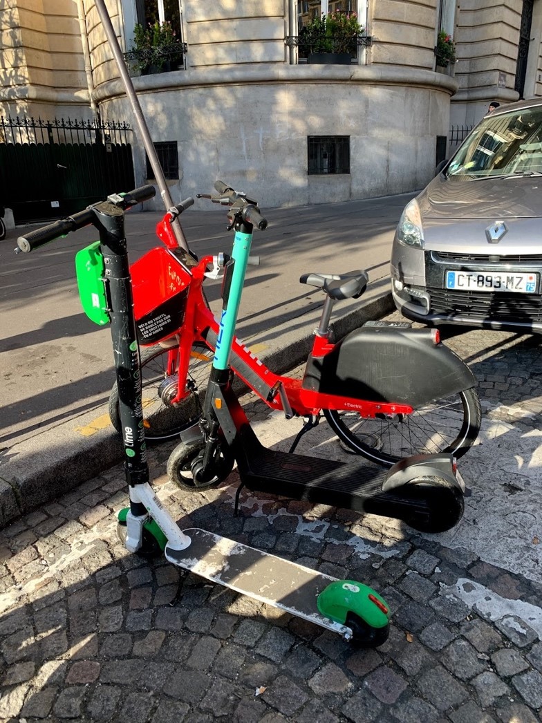 早年巴黎共享單車與滑板車可隨意停放,常常阻礙人行道,或與汽車爭車位。圖片來源:趙偉婷 攝