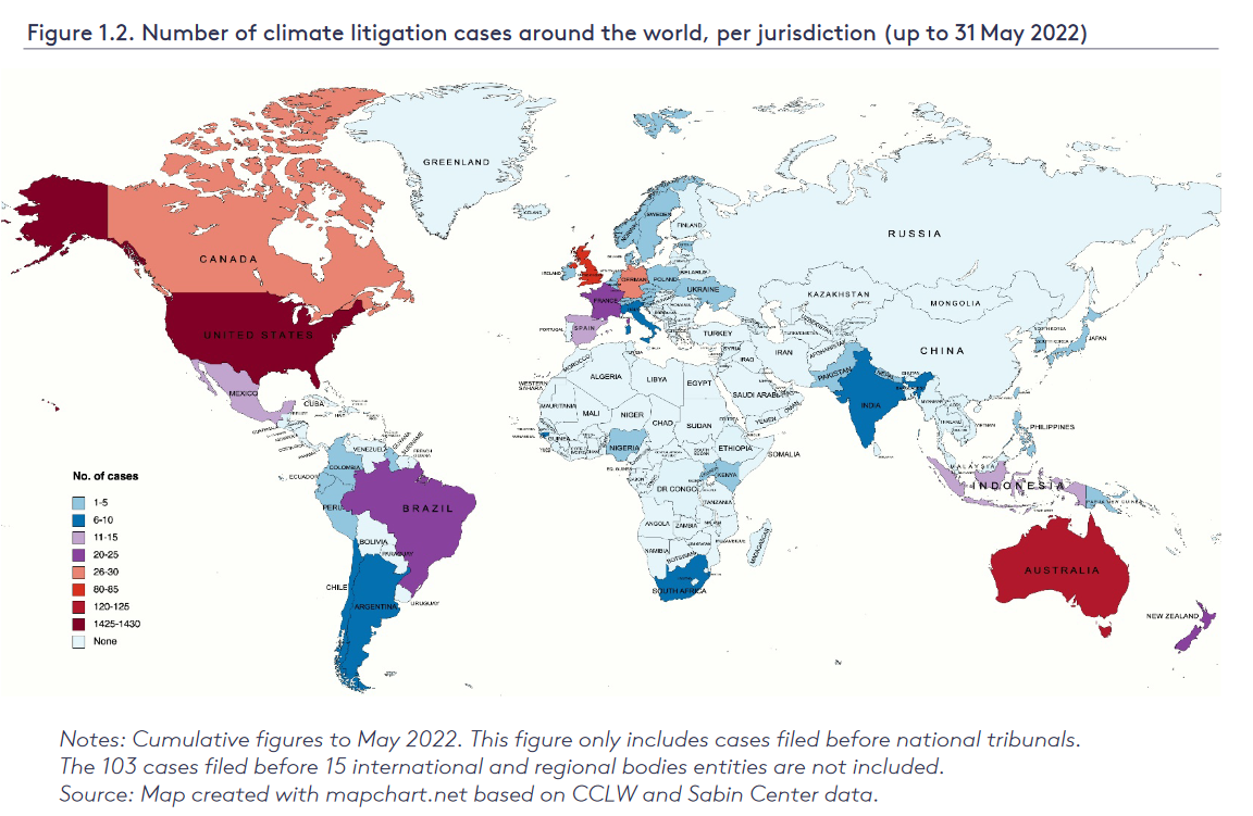 根據美國哥倫比亞大學環境法研究中心的資料,至2022年全球已有2002起氣候訴訟案件。倫敦政經學院《2022氣候變遷訴訟全球趨勢》指出,氣候訴訟案件近年急速成長,2020以降所提出的案件就佔總數約1/4。在所有有紀錄的案件中,約70%位於美國,其次為澳洲、英國。位於南方國家的案件雖占少數,卻有成長趨勢。