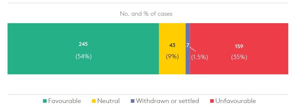 氣候訴訟判決結果對原告有利程度分布。圖片來源:2022倫敦政經學院氣候變遷訴訟全球趨勢