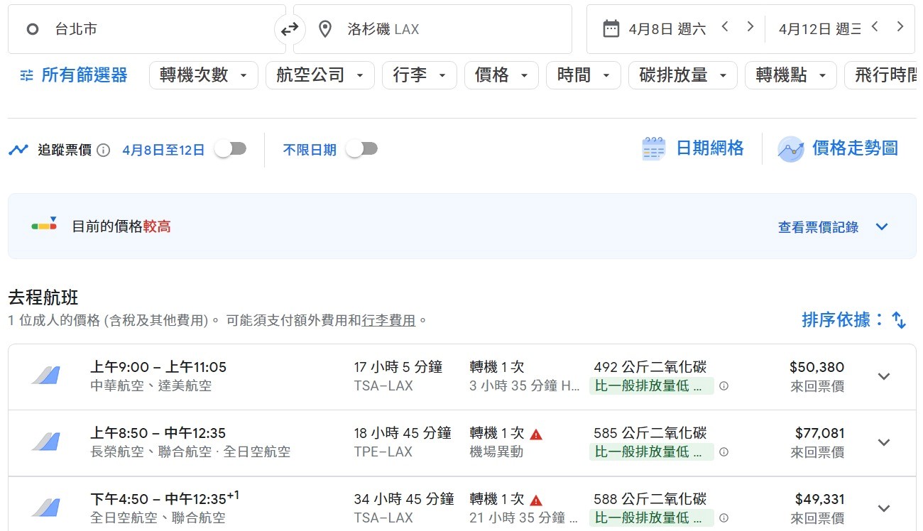 此外,Google Flights除了基本的價格、飛行時間、轉機次數等選項外,還能依碳排放量加以排序,或選擇只顯示排放量較低的航班。