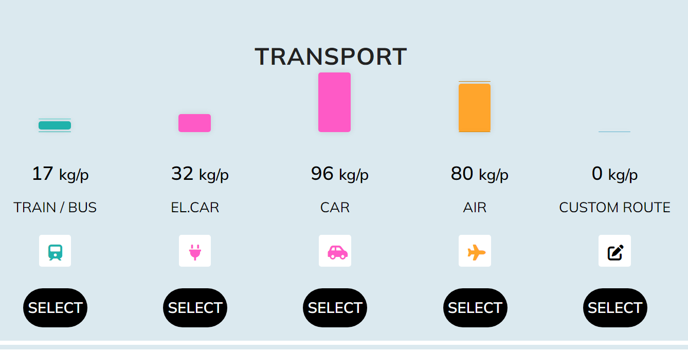 但若是一家四口同行,開車人均產生的二氧化碳就降低至24公斤,成為比搭飛機還友善環境的作法。若是駕駛電動車,人均排碳量更能降至8公斤,比搭乘火車與公車的碳足跡還低。善用該網站,不僅能對各交通工具的環境影響有進一步的認識,也能更有意識的選擇低碳的旅行方式。