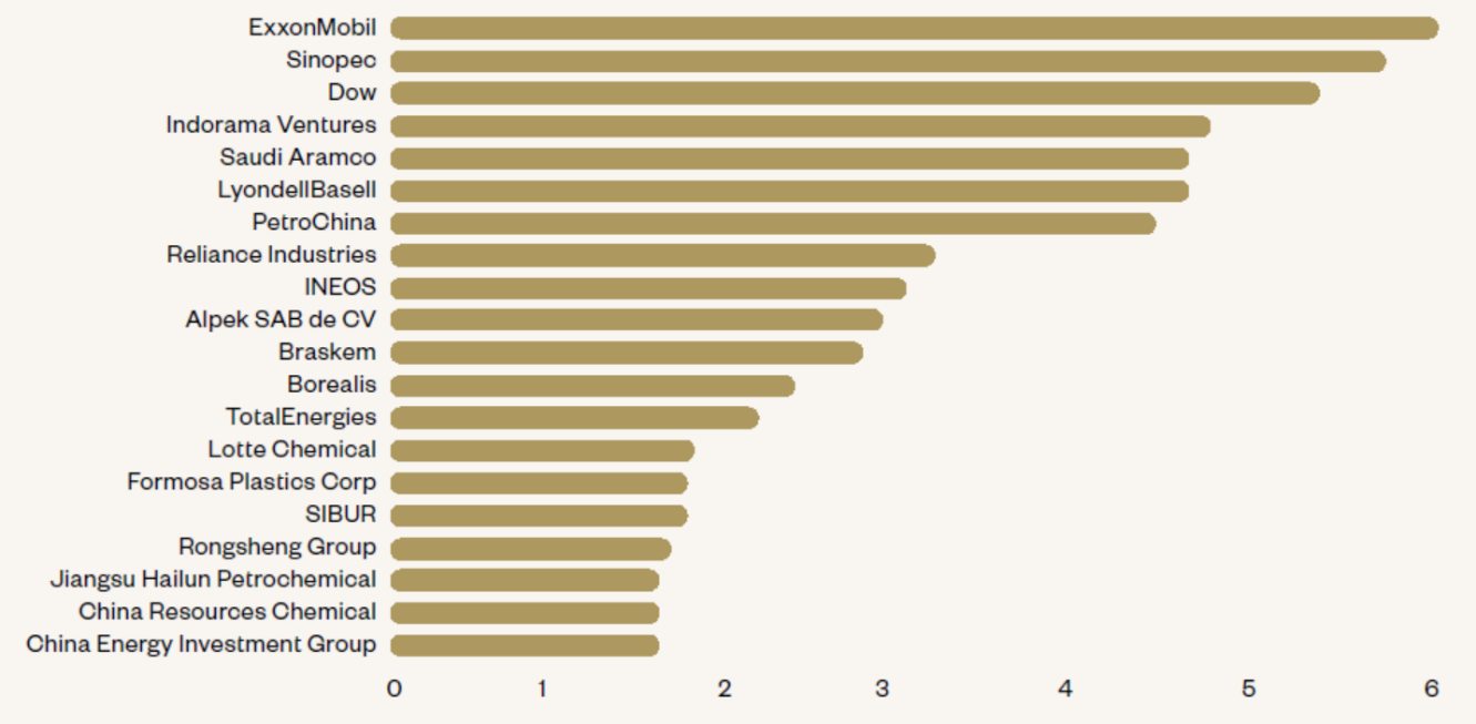 圖一:2021年前20名石化公司產出的一次性塑膠垃圾量(百萬噸)。圖片來源:Plastic Waste Makers Index 2023