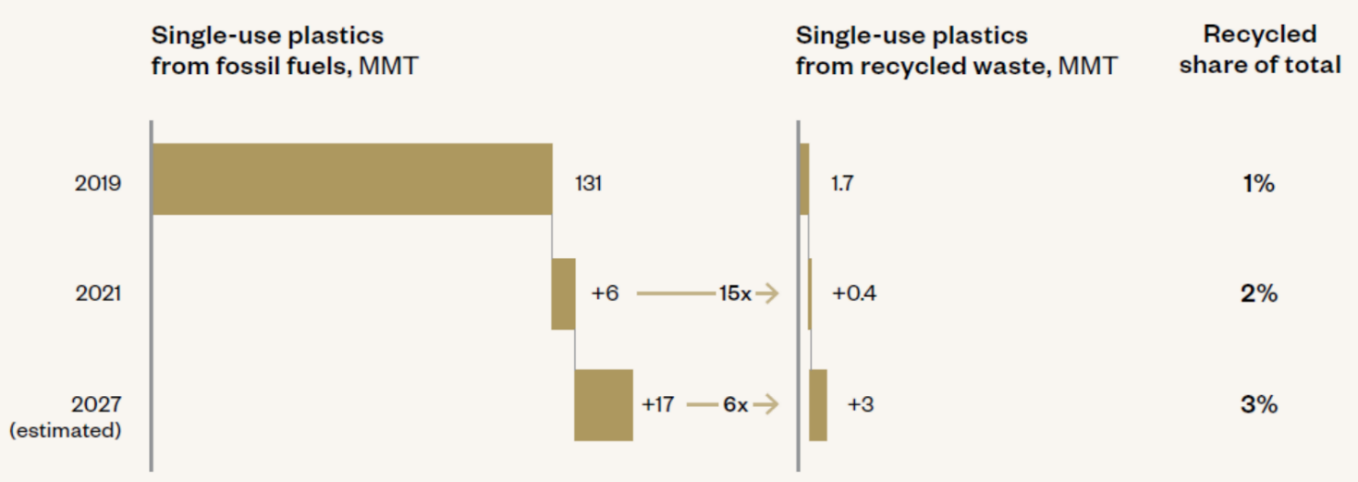 2019年到2021年間增加的一次性塑膠使用量,是回收原料的15倍(圖三)。即使2027年預估新增300萬噸的同等回收能力(70萬噸來自石化產業),但比起6000萬噸新增的塑膠聚合物,全球的回收量能遠不及新增的產能。