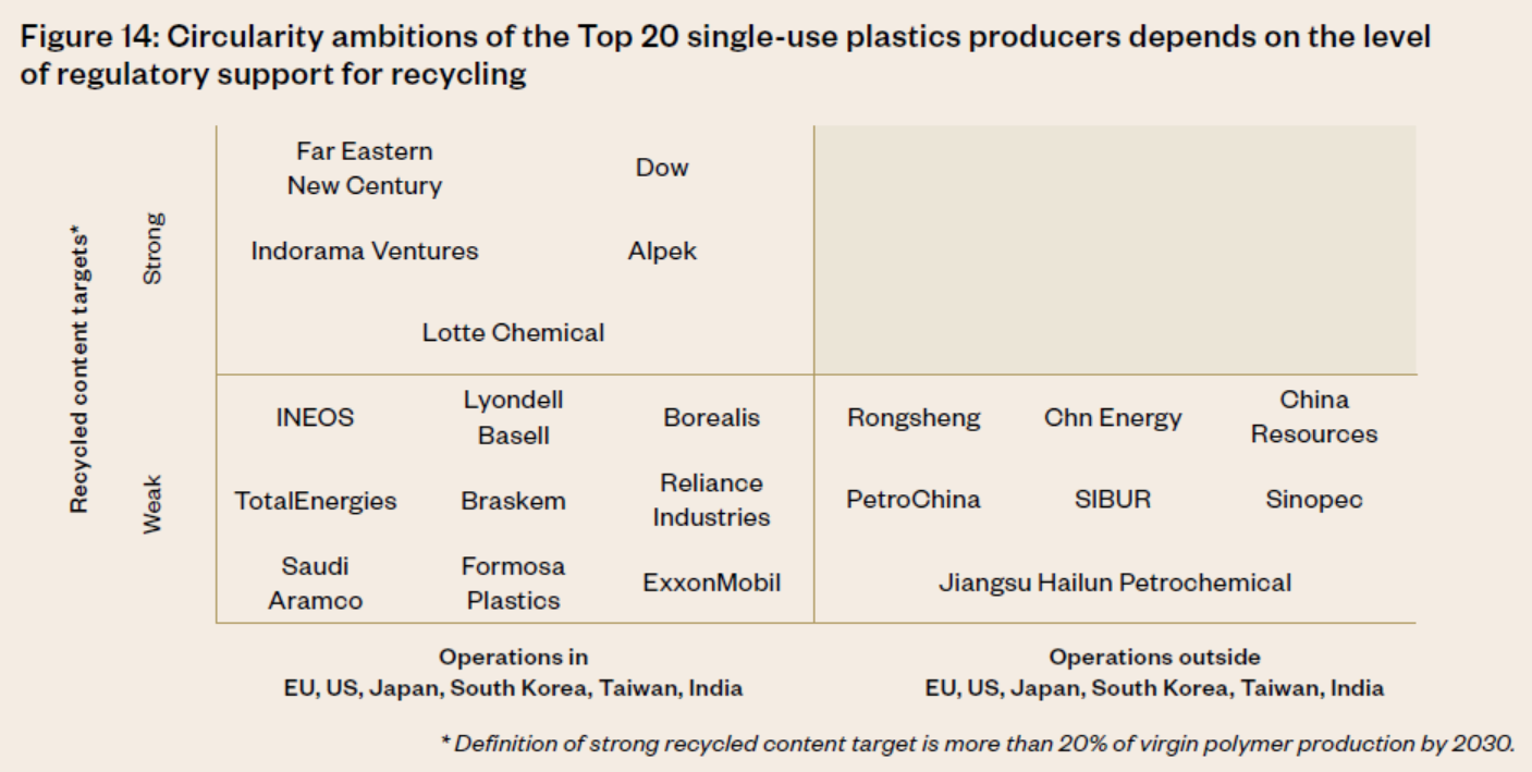 圖四:前20大一次性塑膠製造產商對循環性的野心取決於該地區的監管力道。圖片來源:Plastic Waste Makers Index 2023