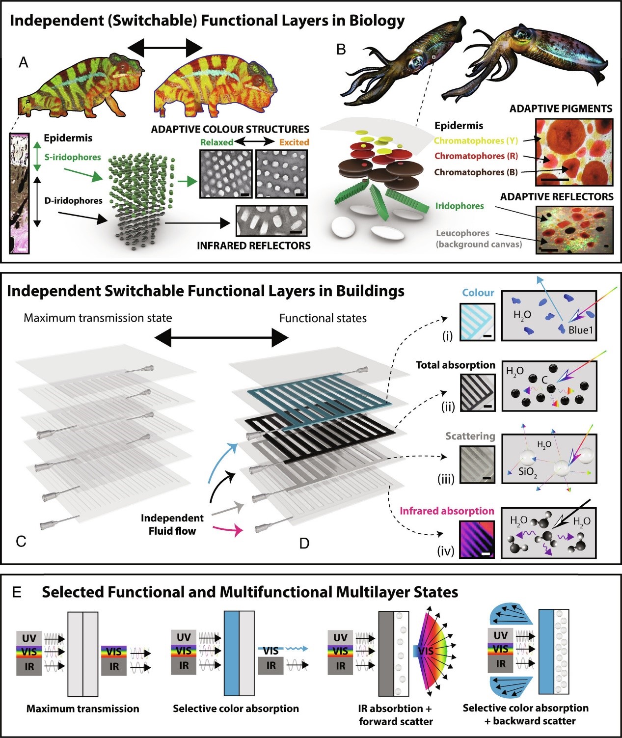 最近多倫多大學材料科學與工程系發表的「變色流體窗戶」就是一例。研究人員從磷蝦、魷魚與烏賊的變色皮膚汲取靈感,研發出有多層流體系統的窗戶。窗戶由多層塑膠片組成,每層注入的特製液體顏料能對太陽光有不同的阻隔力,因此可以有效控制陽光進入室內的強度、柔和度,與帶來熱能的紅外線量。