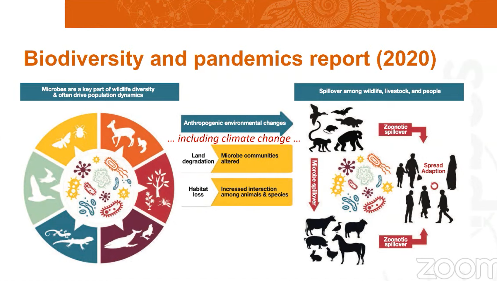 另一份則為跨政府生物多樣性與生態系服務平台(IPBES)所發布的《生物多樣性與傳染病研討會報告》(IPBES workshop on biodiversity and pandemic workshop report),是在2020年COVID-19流行時期,評估傳染病發生與自然關係的相關科學證據。報告指出,大多數的傳染病源自於動物宿主所攜帶的多種微生物,不過因為農業擴張、城市土地開發等人為活動,加上氣候變遷引發的極端氣候狀況與日俱增,導致生物喪失棲地、被迫遷徙,不僅衝擊生物生存,也增加了人類與物種的接觸,這是傳染病發生的根本原因。