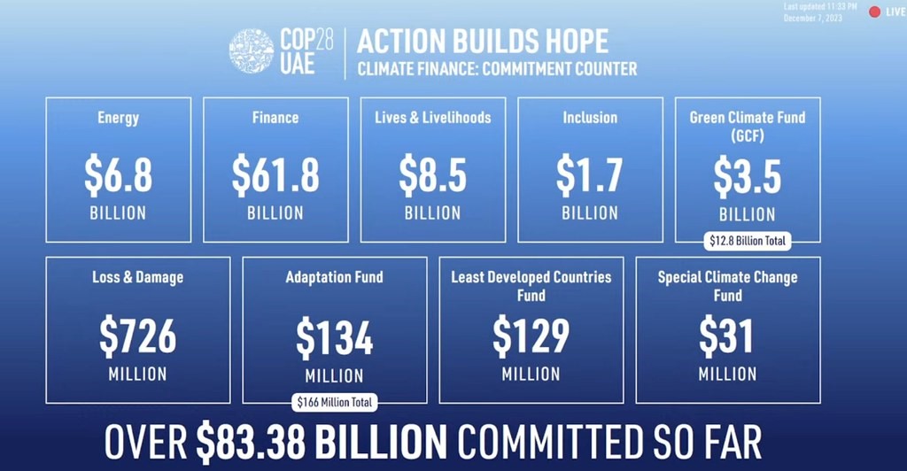 截至12月6日,大會進入第二個星期之前,官方網站上承諾計時器(Climate Finance: Commitment Counter)的數字不斷更新,損失與損害的補助金額已經來到7億2600萬美元。但對照每年平均約4000億的需求,這些錢還少於需求的0.2%,真的是微不足道。