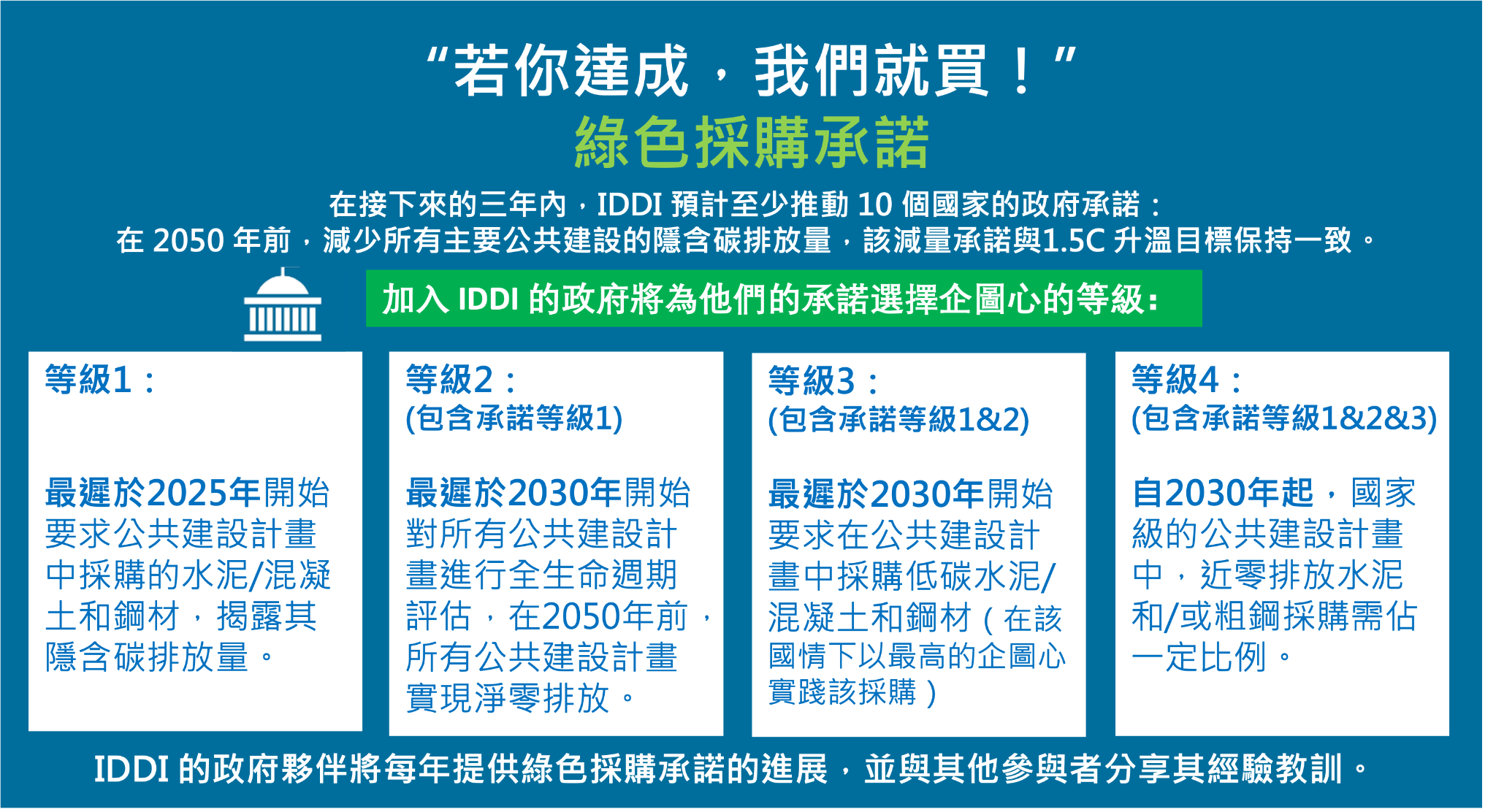其中IDDI在今年有了新進展,加拿大、德國、英國和美國政府皆已把去年的口頭承諾轉化為法規政策或實際行動,且就四個等級的低碳採購時間表提供了明確的承諾規劃。