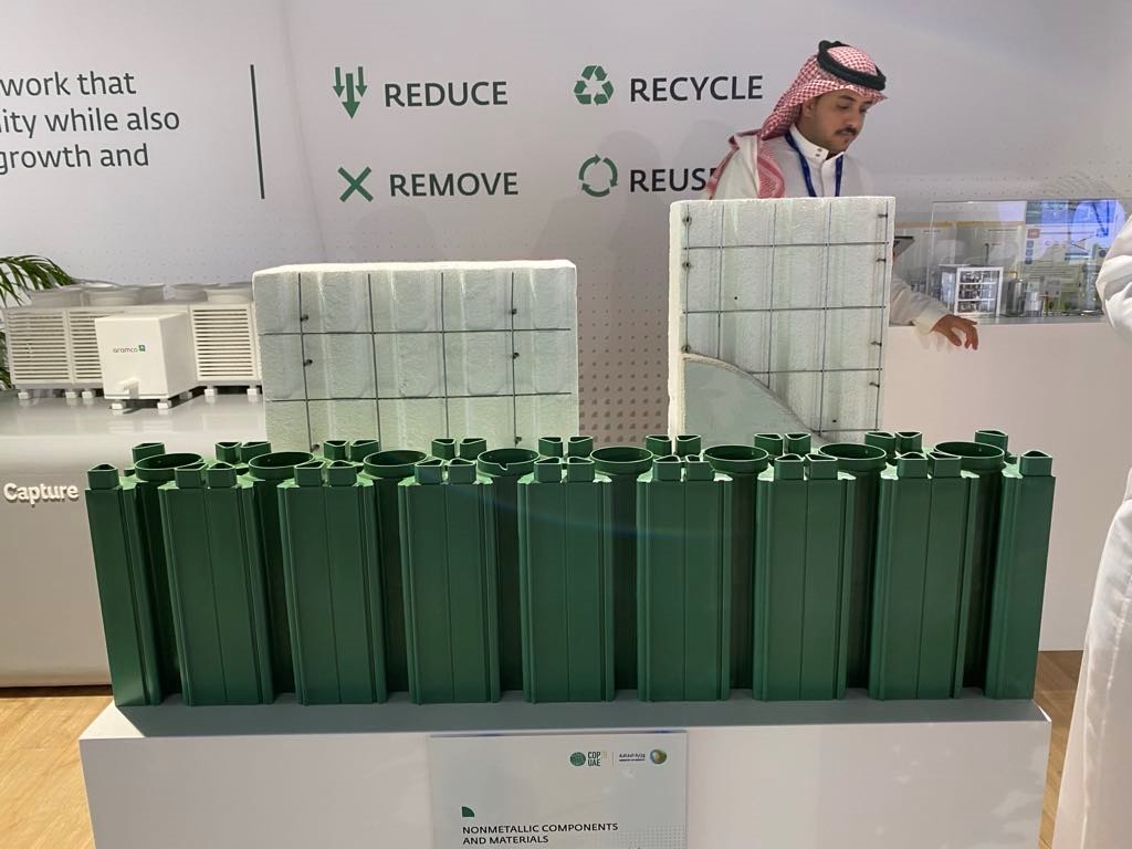 現代建築需要大量使用鋼鐵與水泥等高碳排建材,在沙烏地阿拉伯館中展示了另一種建材選用的可能。Emmedue公司發展出Advanced Building System,是利用發泡聚苯乙烯製成、由鍍鋅鋼網包圍的面板,作為建築外殼,透過發泡聚苯乙烯材料本身材料特性,幫助建築達到保溫隔熱的效果,此外,發泡聚苯乙烯比起鋼筋水泥更為輕盈,也能降低運送建材過程中的碳排放量。