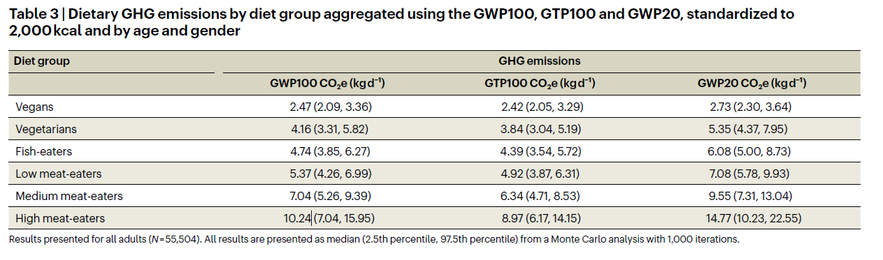 根據《BBC》報導,這項研究收集了五萬5000名受試者的數據並分析後發現,以成年人一日所需約2000大卡的熱量來看,若依照不同飲食型態統計平均溫室氣體的排放量,多肉主義者(high meat-eaters,指每日攝取超過100公克的肉類)平均會產生10.24公斤的碳排放;而少肉主義者(low meat-eaters,指每日攝取約50公克或更少的肉類)則平均會產生5.37公斤的碳排;魚素飲食4.74公斤;素食飲食4.16公斤;純素飲食者製造的碳排則可低至2.47公斤。由此可以看出多肉的飲食習慣,碳排遠大於其他飲食習慣者的排放二倍到五倍之多。