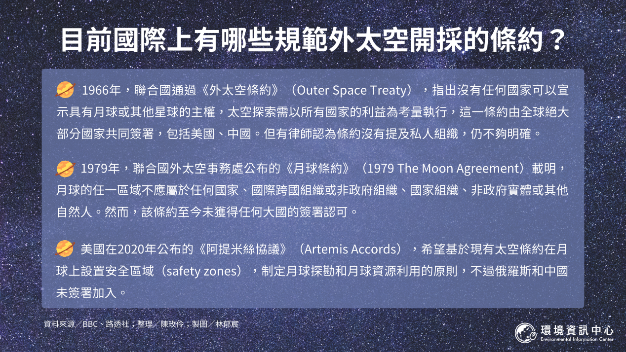 月球上要採什麼礦?據《BBC》報導,月球上有三種主要的資源:水、氦和稀土。NASA估計,月球上有 100 萬噸的氦同位素「氦-3(Helium-3)」。根據《路透》,這種在地球上稀有的同位素可以為核融合反應器提供能量,且因其不具放射性,並不會產生危險的核廢料。此外,在月球上還有鈧、釔和15種鑭系元素,是可以用於智慧型手機、電腦等先進科技的稀土金屬。