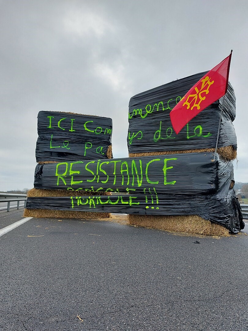 農民們用牧草製成路障,再掛上抗議標語。照片來源:Raymond Trencavel/Wikipedia(CC0)