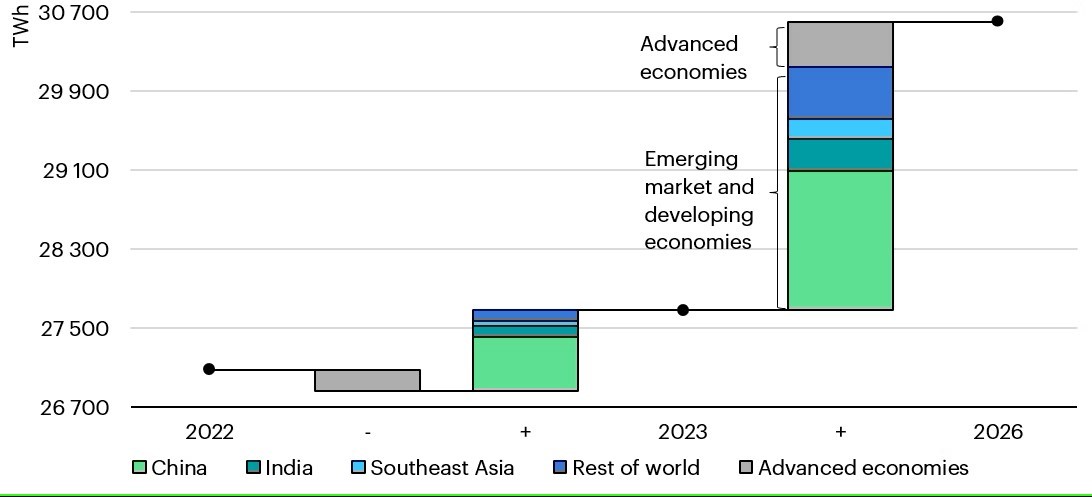 2022年至2026年各地區電力需求變化。圖片來源: International Energy Agency