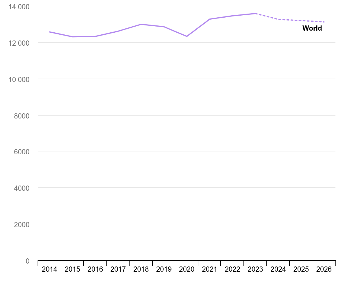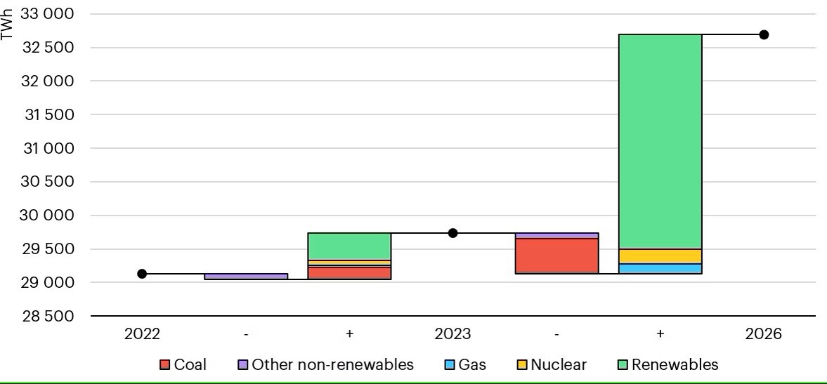 2022年至2026年全球發電量變化。圖片來源: International Energy Agency
