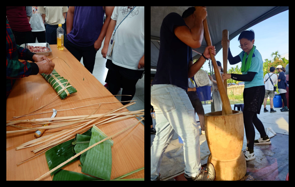 左:部落耆老示範製作原住民傳統食物-奇拿富。右:使用原民傳統方式幫小米脫殼。攝影:王人平