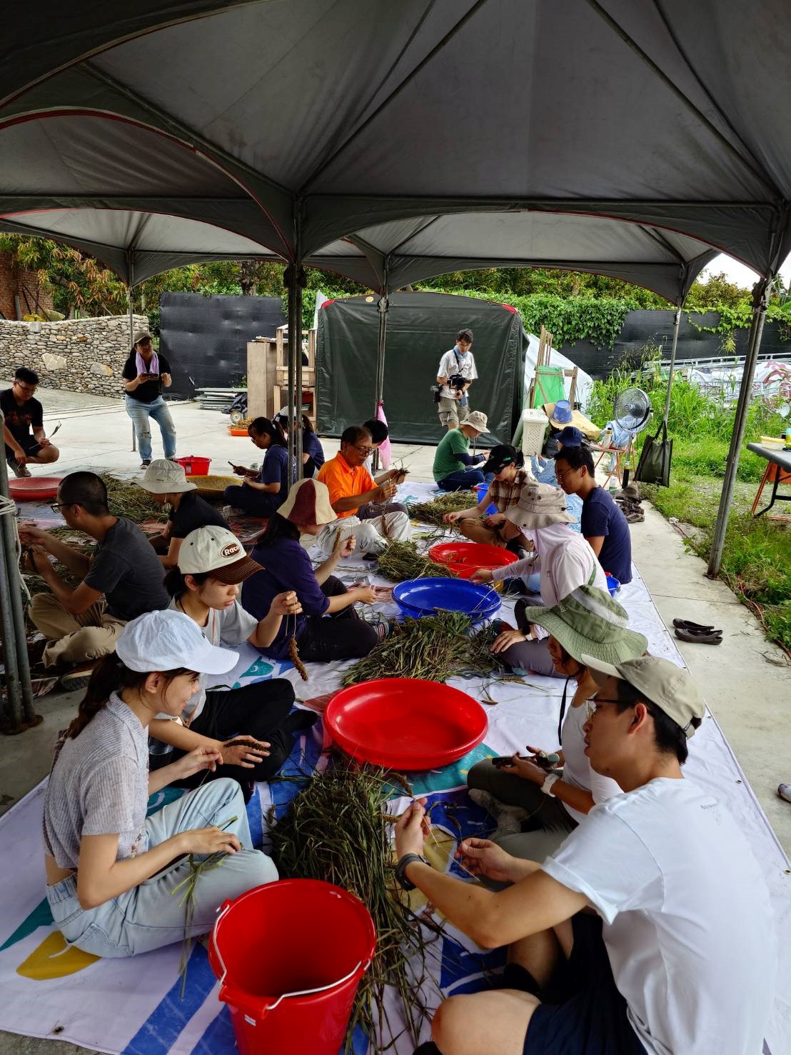 工作坊中學習如何整理綁紮小米束。攝影:王人平