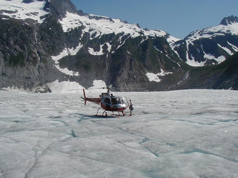 許多遊客會選擇直升機套裝行程,一覽曼登霍爾冰川的壯觀景象。照片來源:Todd VerBeek/Wikimedia Commons(CC BY-SA 1.0)