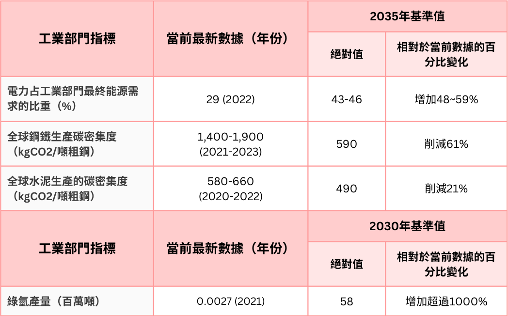 2035 年與 1.5°C 路徑保持一致的工業部門基準值。資料來源:作者摘自UNEP《2024排放差距報告》