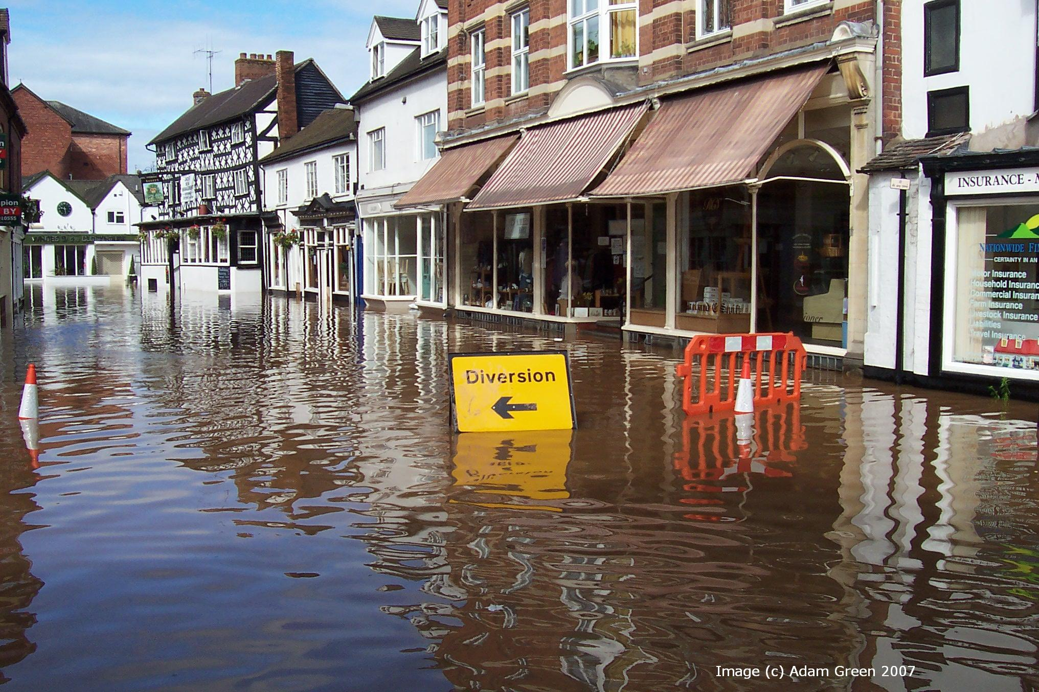 2007年坦伯里威爾斯鎮上遭遇洪災一景。英國環境局近來一份報告指出,到2050年,英國高達1/4、800萬處房產可能面臨洪水風險。照片來源:Ag290190/Wikimedia Commons(CC BY-SA 3.0)