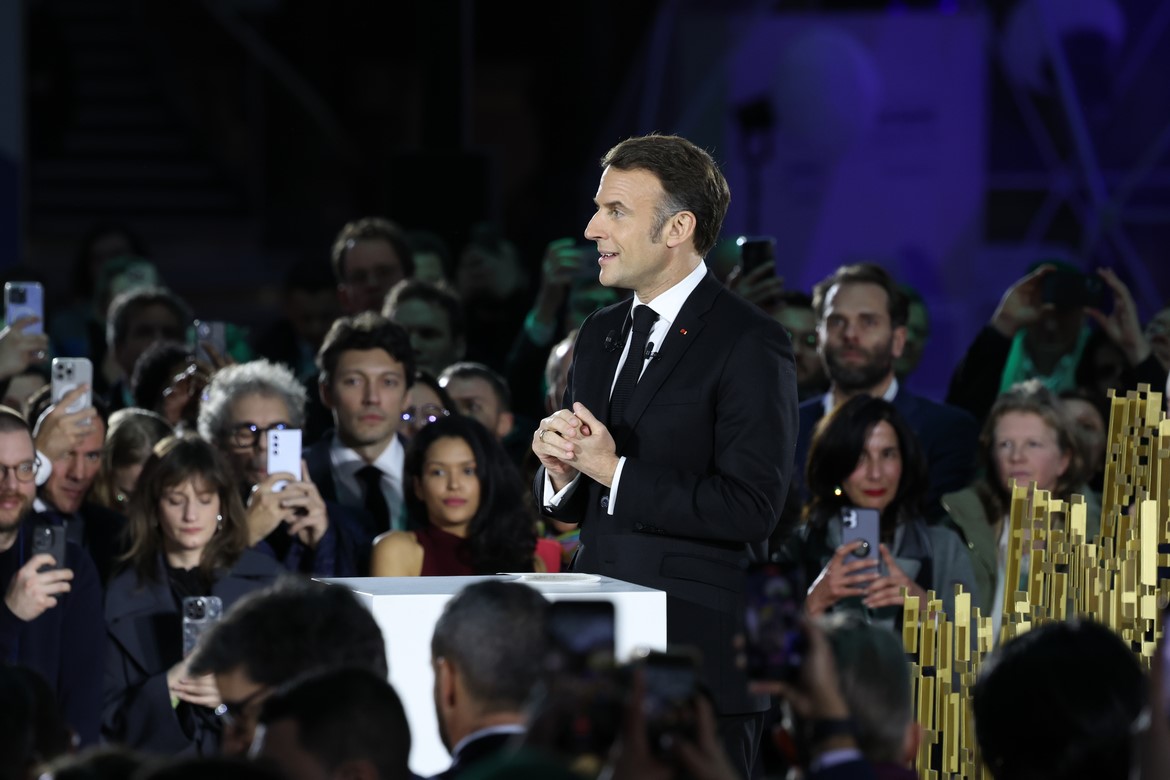 今年峰會邁入第三屆,歐洲各界紛紛在會中表態將積極投入AI產業並規劃更簡化的監管機制。圖為法國總統馬克宏主持峰會現場。照片來源:Élysée