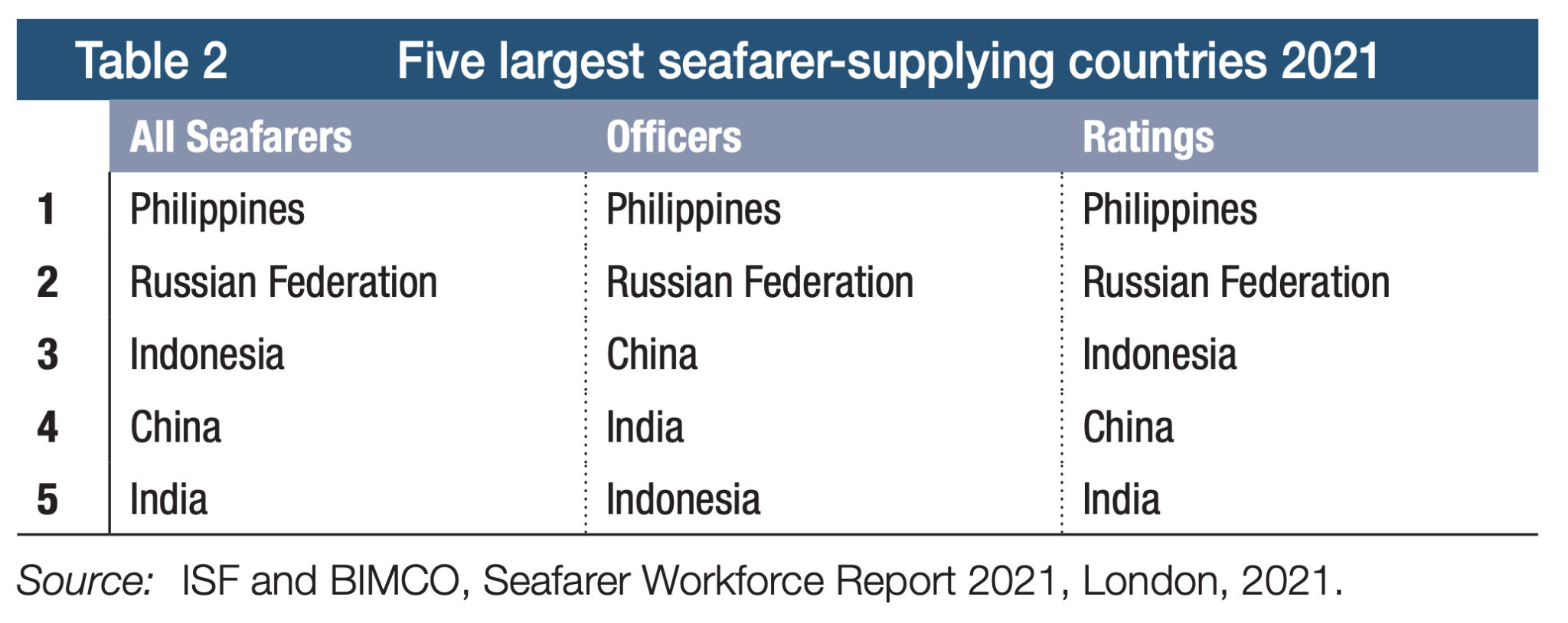 根據聯合國貿易和發展會議(UNCTAD)2021年的統計報告,全球船員勞動力輸出前五名分別為菲律賓、俄國、印尼、中國、印度,佔全球船員勞動力 44%,其中菲律賓和印尼合計佔了21%。