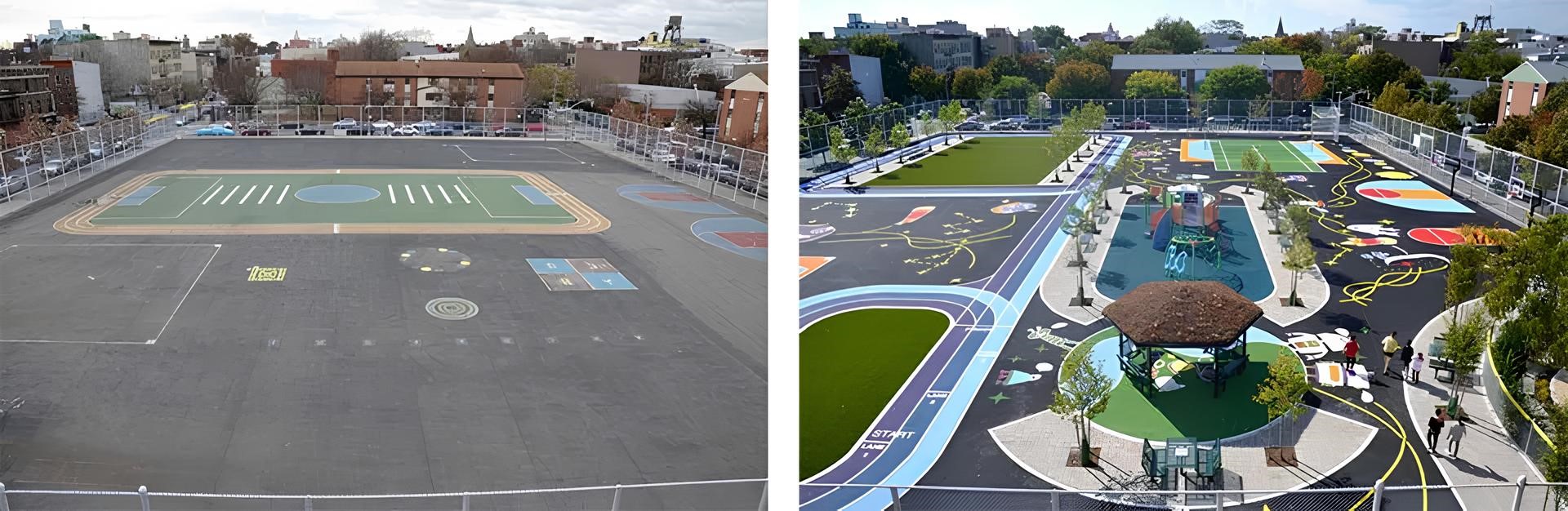 在過去,費城的阿代爾(Adaire)小學操場就是一片單調的瀝青地,四周裝上幾個孤零零籃球框,沒有人會在那邊休憩,放學後就乏人問津。