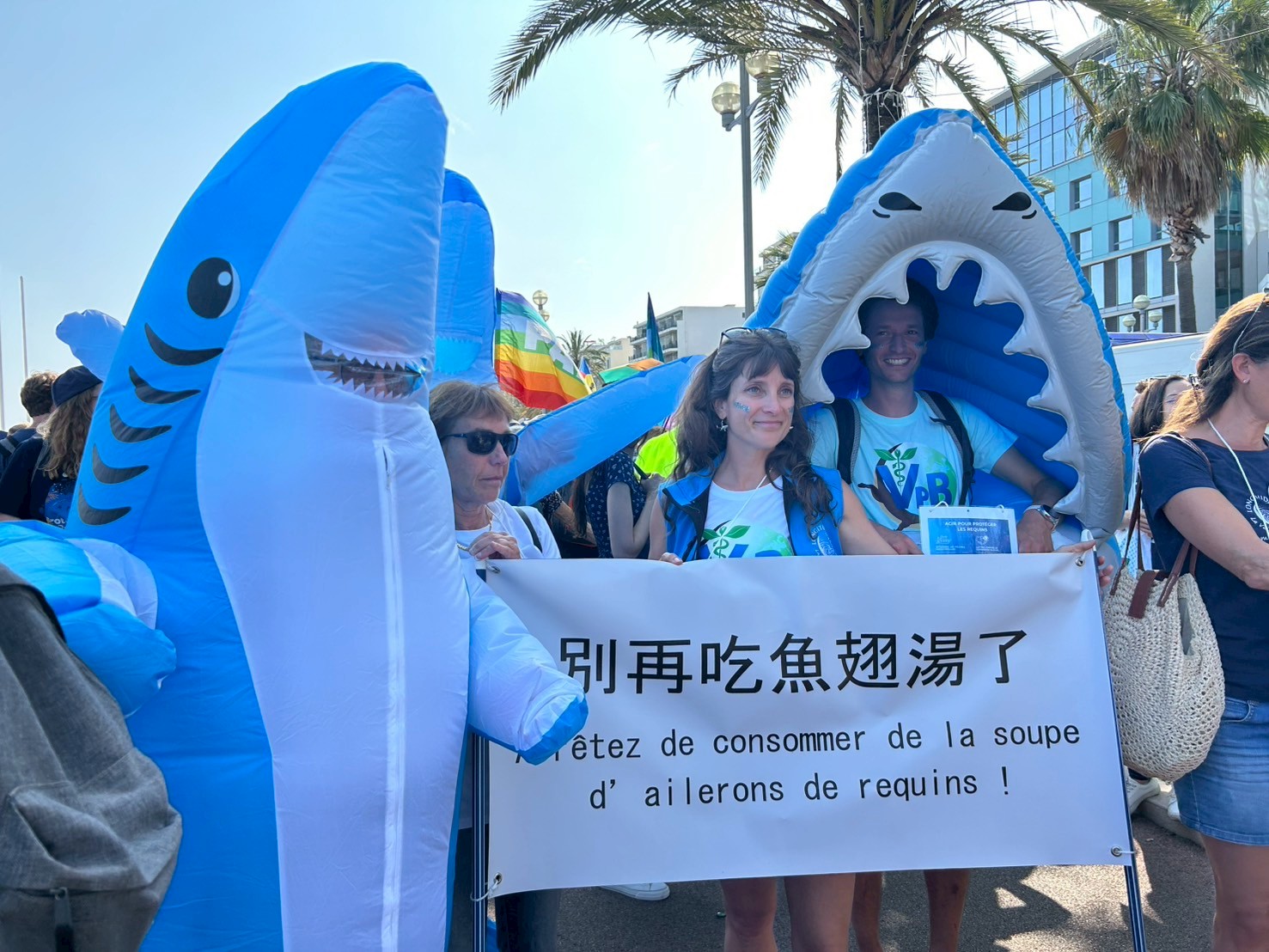 來自阿根廷的音樂工作者Agustina Cicchetti帶著5歲兒子到來。兒子在紙上塗上厚厚的紅色,說因為海洋正在改變、不再是藍色。現場也有人穿著鯊魚裝高舉著「別再吃魚翅湯了」的中文布條。