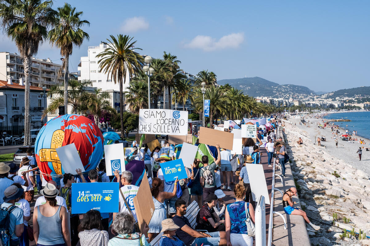 民間團體於7日聯合國海洋大會開幕前,在法國尼斯發起遊行,呼籲加強海洋保育。圖片來源:綠色和平 提供