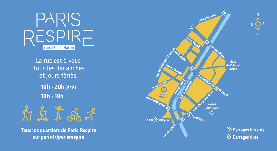 巴黎喘息計畫會於每週日與國定假日封路專供行人、自行車騎士等用路人使用。圖為在巴黎聖馬丁運河附近的宣導圖。照片來源:巴黎市政府