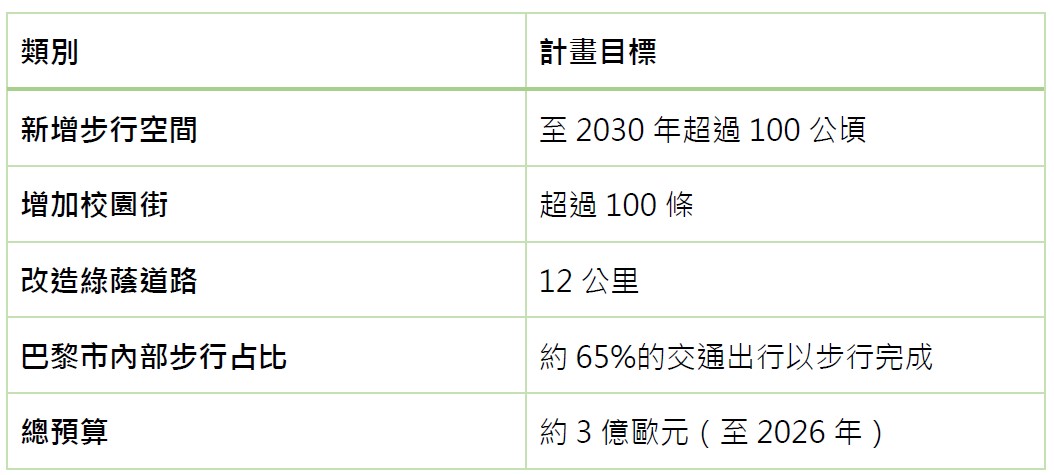 巴黎行人優先計畫的主要目標與預算。製表、整理:趙偉婷。