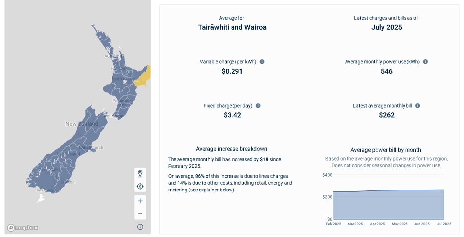 根據紐西蘭電力局統計,2025年7月Gisborne平均每個月應繳262紐幣電費(約新台幣4772元)。照片來源:擷取自紐西蘭電力局