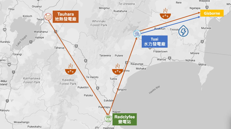 來自Tauhara地熱發電廠(位於陶波湖)的電,需先經過Redclyhee變電站(位於霍克斯灣),再傳送到Tuai水力發電廠(位於在懷卡雷莫阿納湖),接著提供吉斯伯恩使用。製圖:楊軒妮