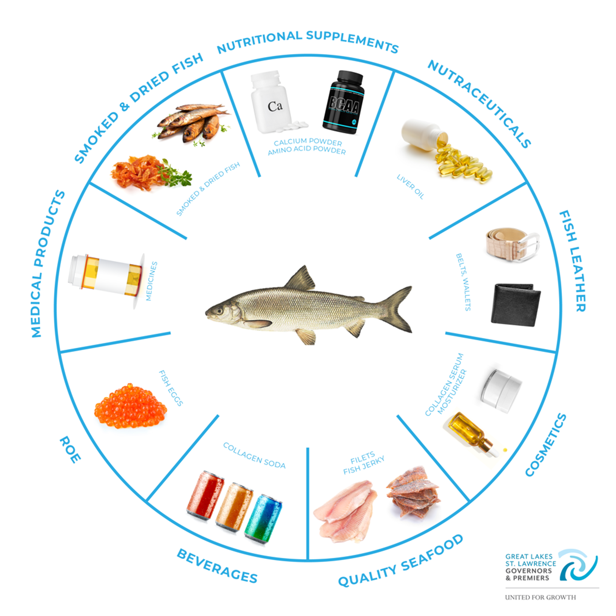 答案很簡單:物盡其用。過去, 范蘭舒特會將剩下的邊角料拿去做肥料,雖然減少了垃圾,但這麼做並沒有收入進帳。如今,出現了另一種選擇。政府間組織「五大湖與聖勞倫斯首長聯盟」(GSGP)發起了「五大湖魚類100%利用計畫」(100% Great Lakes Fish Initiative),希望實現「全魚利用」,為每條魚尋找更高價值的用途,不僅能建立更永續的產業,也將為五大湖地區漁村帶來更高的經濟效益。