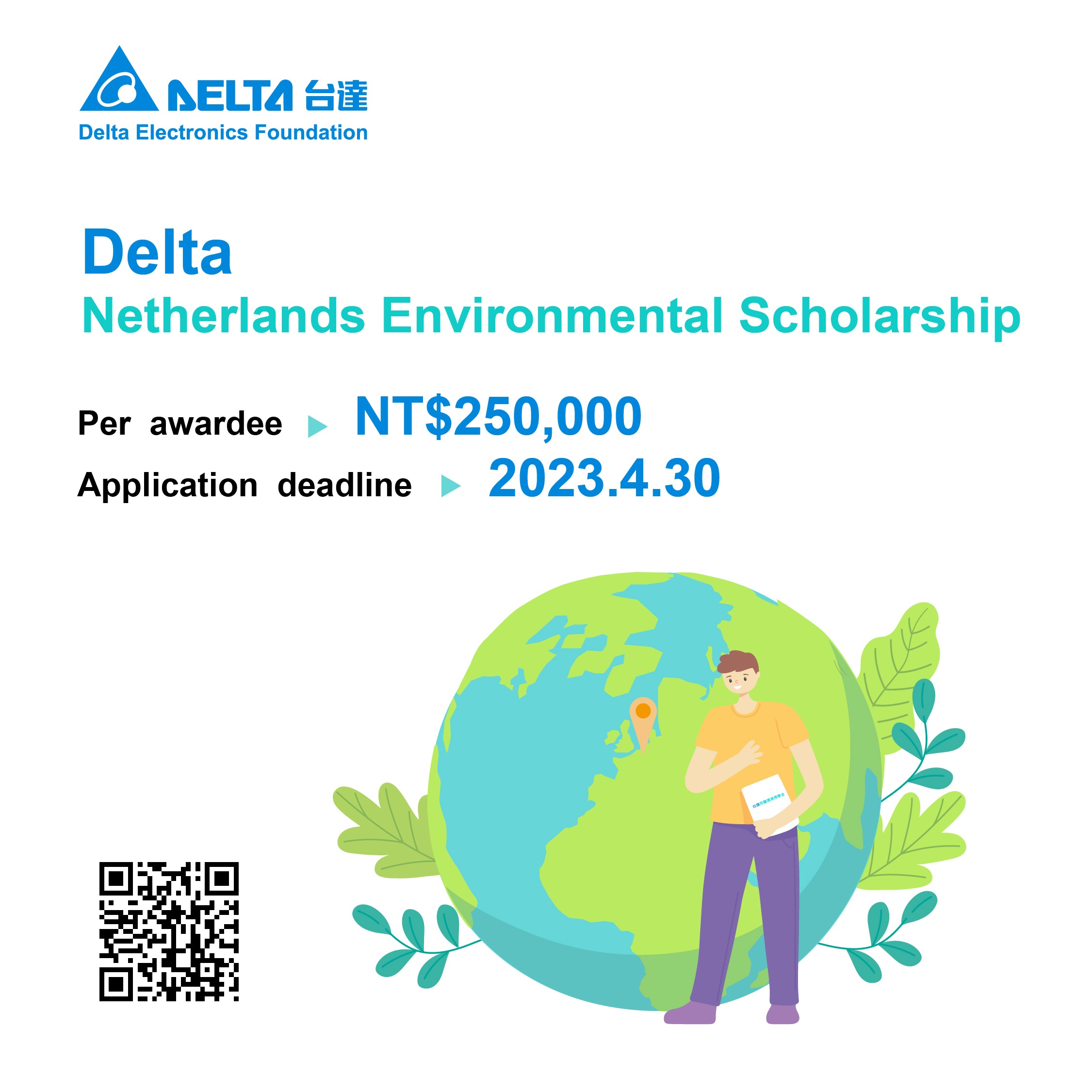 The 2023 Delta Netherlands Environmental Scholarship is open to application. Anyone who hopes to pursue sustainability studies in the Netherlands is welcome to submit the application. The scholarship offers a grant of NT$250,000 to each graduate student during the study period.
