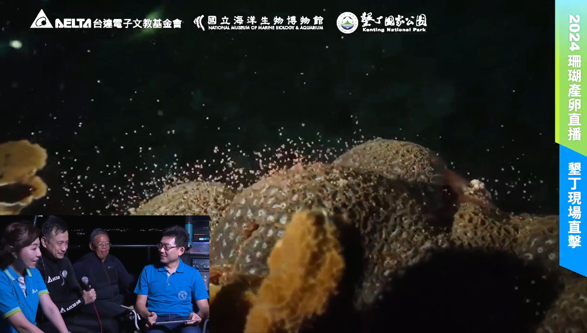 Corals exhibit a large-scale spawning phenomenon as one of their reproductive strategies. Since corals cannot move, sexual reproduction relies on the rapid release of a large number of eggs in a short period of time. Fertilization occurs externally in seawater, after which the zygotes settle on the sea floor and eventually develop into corals. The Kenting area itself has a unique hot spring water temperature, which is a potential reason for maintaining the coral ecology well and even helping to enhance the coral recovery ability. The site chosen for the Foundation's live stream is outside the water intake of the Maanshan Nuclear Power Plant in Kenting. The diversity and coverage of coral species are high, making it an excellent place to observe spawning phenomena.