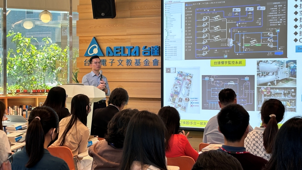 The event invites three representatives respectively from the International Climate Development Institute (ICDI), Delta Energy Management System Department, and Delta Research Center. They introduce how Delta makes use of weather forecasts to help our Chungli Plant 5 to achieve energy savings by 18%, how an office building becomes the first one to reach nearly zero carbon in Taiwan under the Building Energy-Efficiency Rating System, and how digital twin assists our data center, production line, and logistics in reducing energy consumption.
