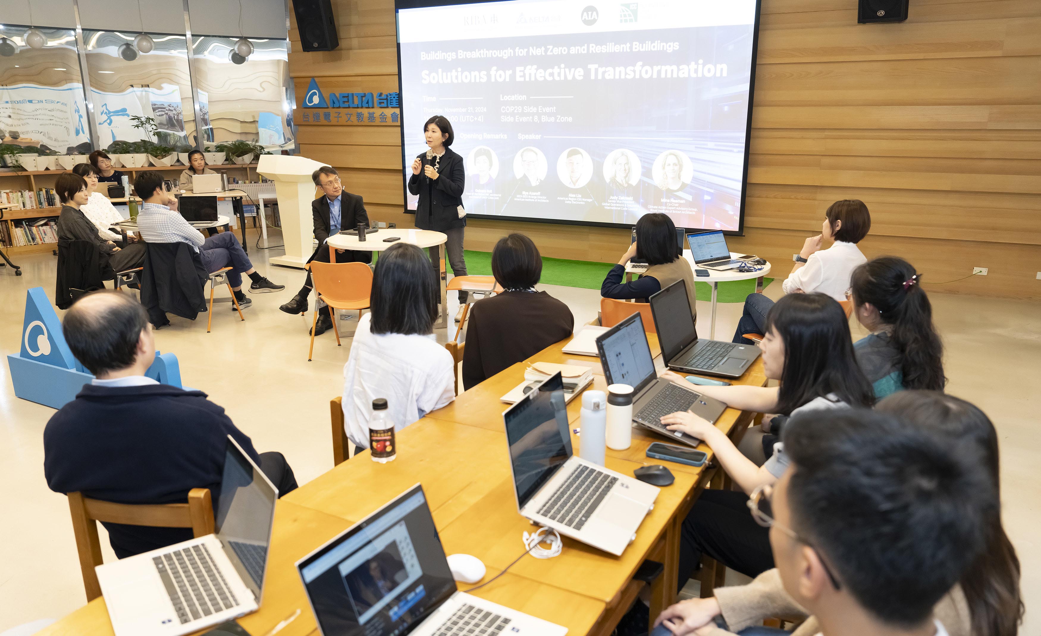 At COP29, Delta co-hosted an official side event, collaborating with the American Institute of Architects, the Royal Institute of British Architects, and the International Code Council to discuss leveraging core technologies for developing energy-efficient building solutions.