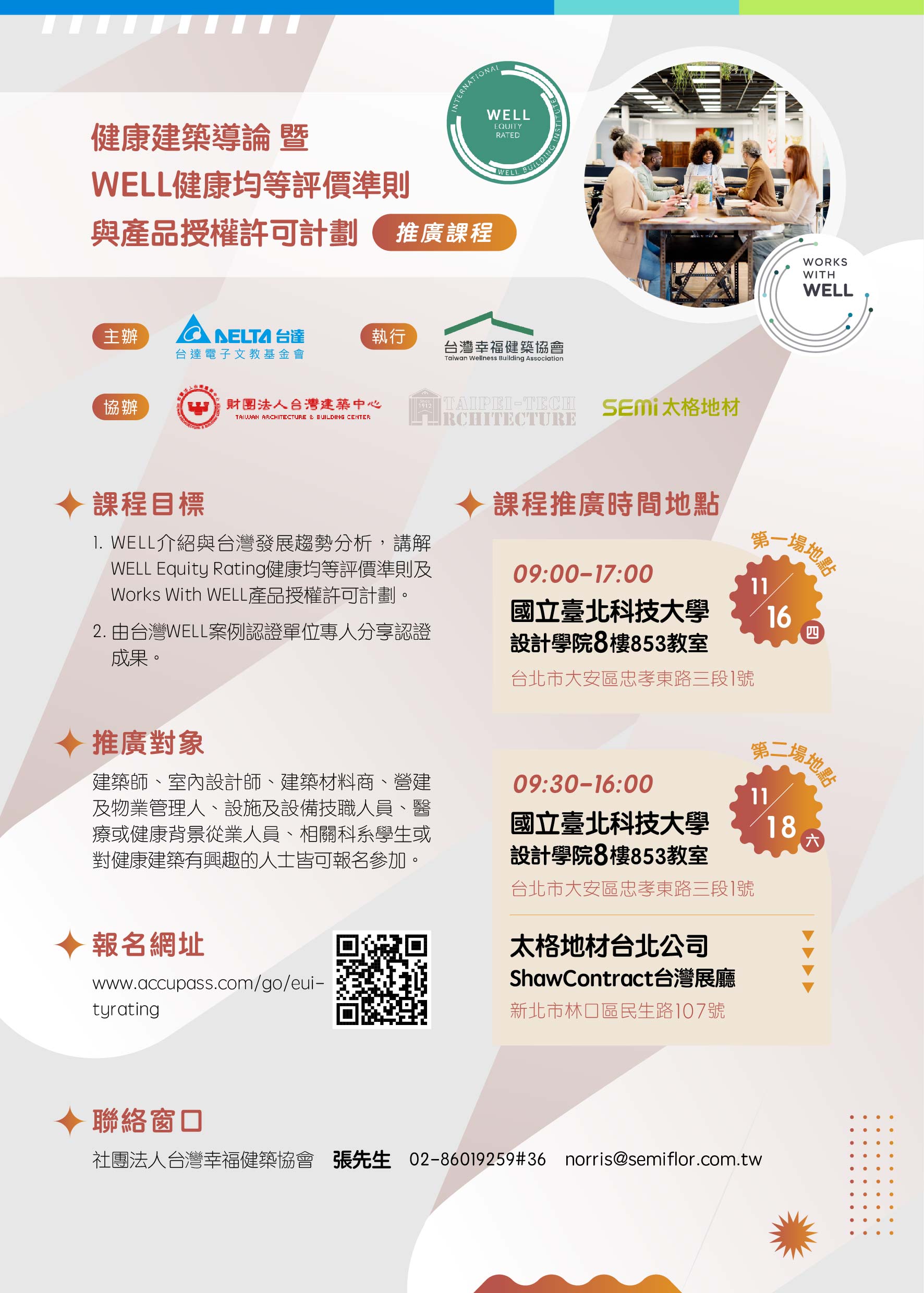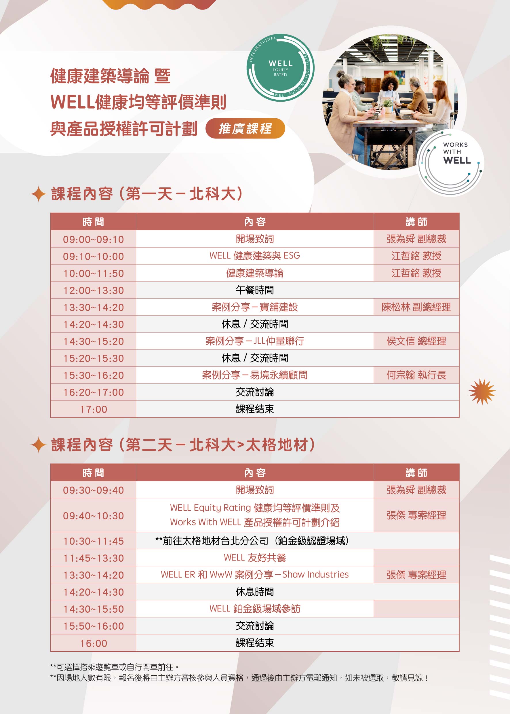 1.WELL介紹與台灣發展趨勢分析、講解WELL Equity Rating健康均等評價準則及Works With WELL產品授權許可計劃。