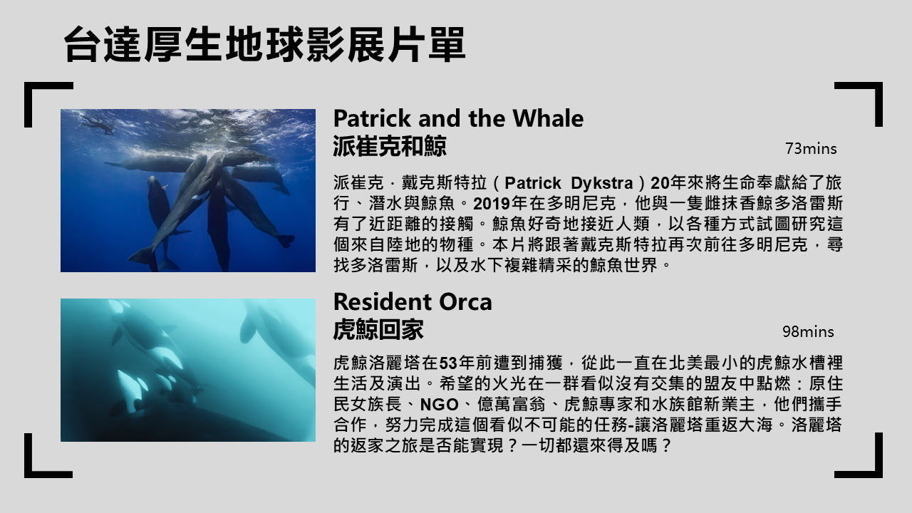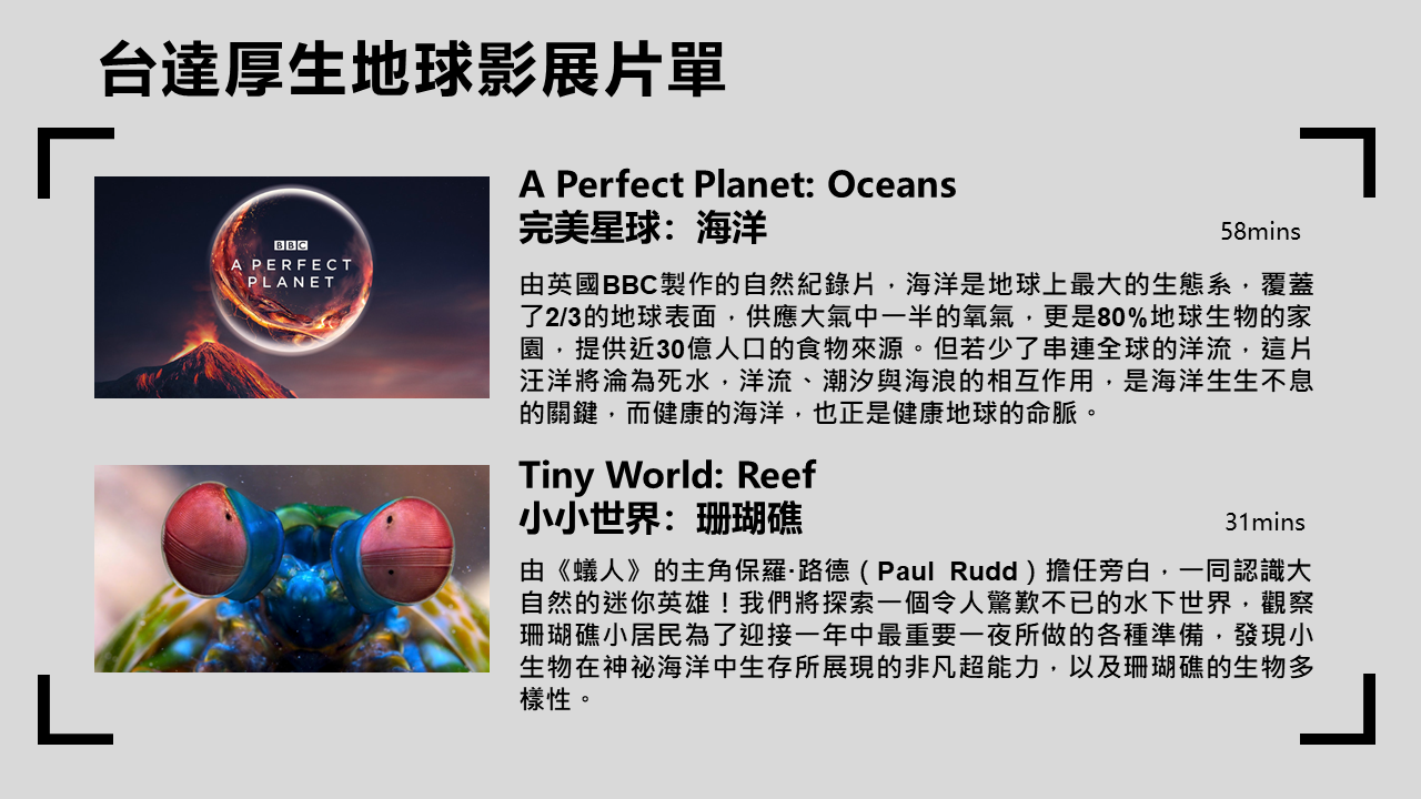 生物多樣性受到氣候變遷的衝擊,正在加速流失,人類對於自然資源的過度消耗,也使自然系統面臨崩潰的系統性風險。台達基金會與素有「綠色奧斯卡」的英國Wildscreen合作特別授權超高畫質4K影像,將與全台各博物館所合作放映,並透過專家分享海洋面臨的環境變遷,鼓勵大眾守護生物多樣性。