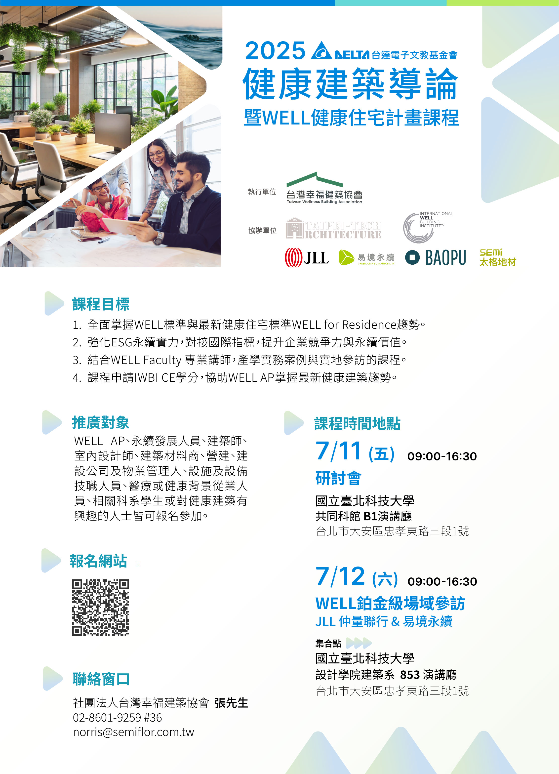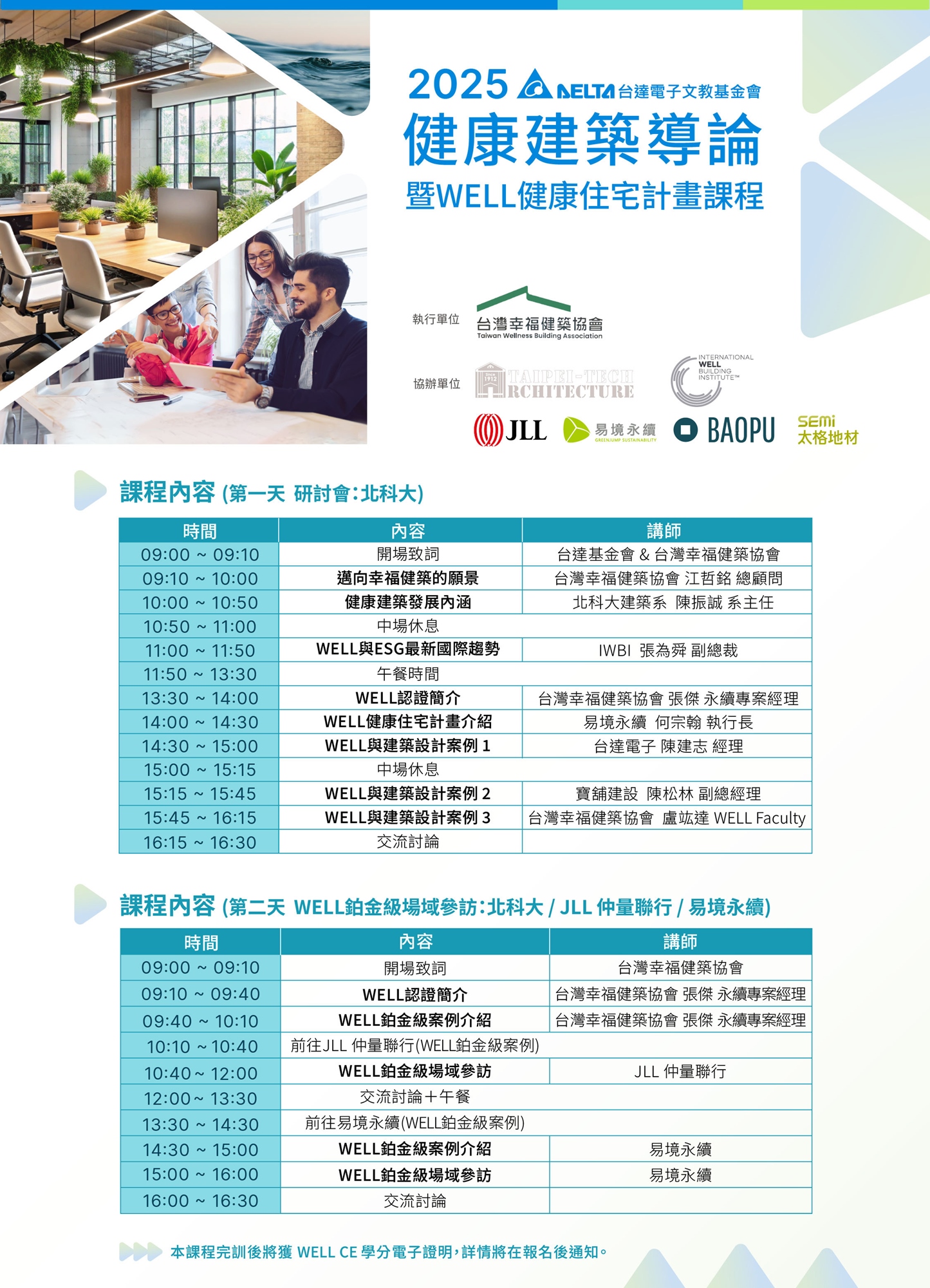 本次課程由台達基金會出資,委託社團法人台灣幸福健築協會執行,透過專業培訓與案例分享,推動台灣健康建築與ESG的發展。課程將於7/11-7/12舉行,為期兩天,內容涵蓋WELL健康建築標準與ESG的關聯性,深入探討WELL如何與國際永續框架對接,並協助企業透過健康建築提升整體永續價值。此外,課程亦將介紹WELL健康住宅計畫(WELL Residence),說明該標準如何針對住宅環境提供全面的健康支持策略,並帶領學員解析台灣WELL認證案例,從實際案例中學習成功經驗與應用策略。