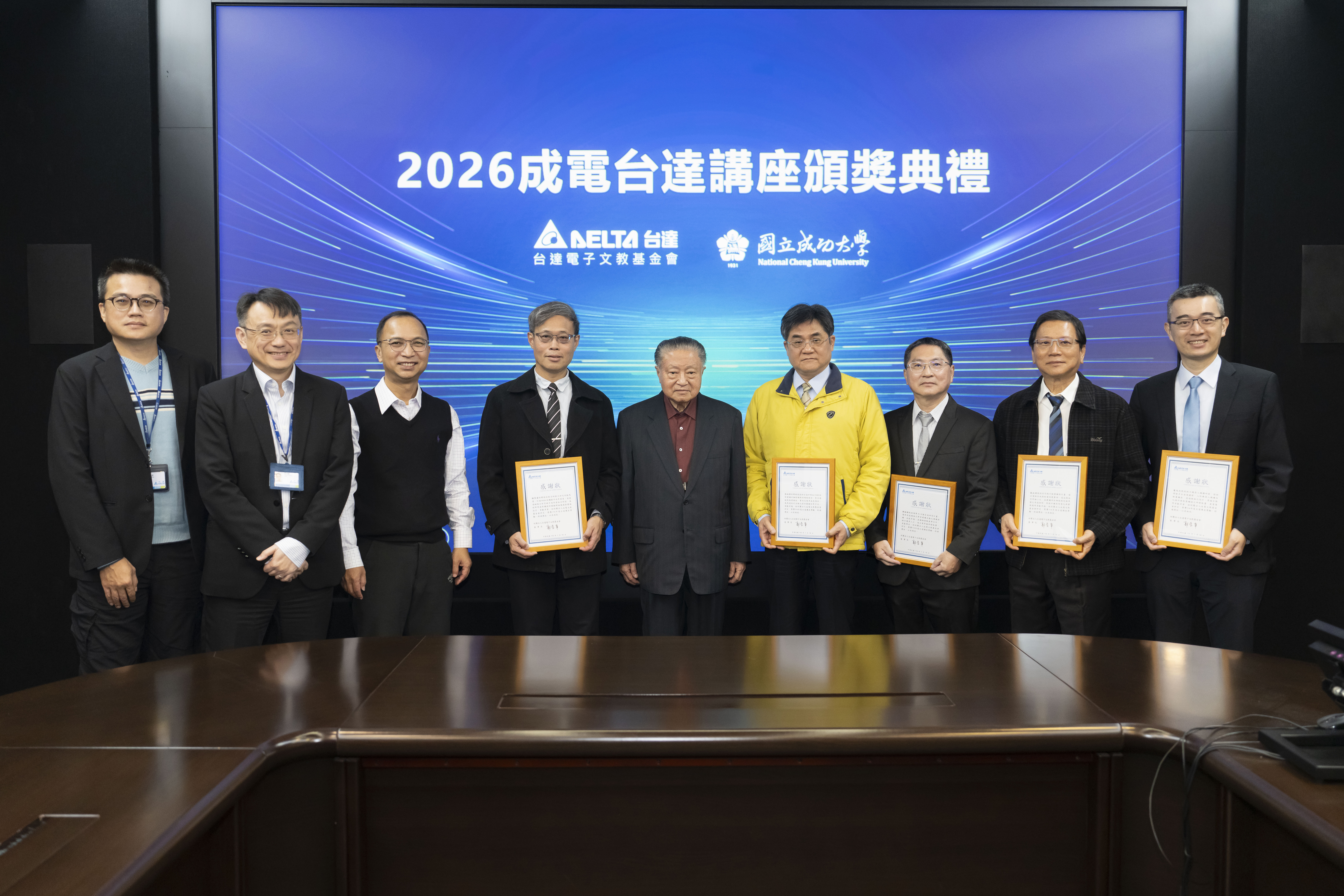 台達電子文教基金會董事長鄭崇華(右5)及「成電台達講座」獲獎者合影,依序為成功大學藍兆杰教授(右1)、戴政祺教授(右2)、鄭銘揚教授(右3)、張始偉特聘教授(右4)、謝旻甫特聘教授(左4)。