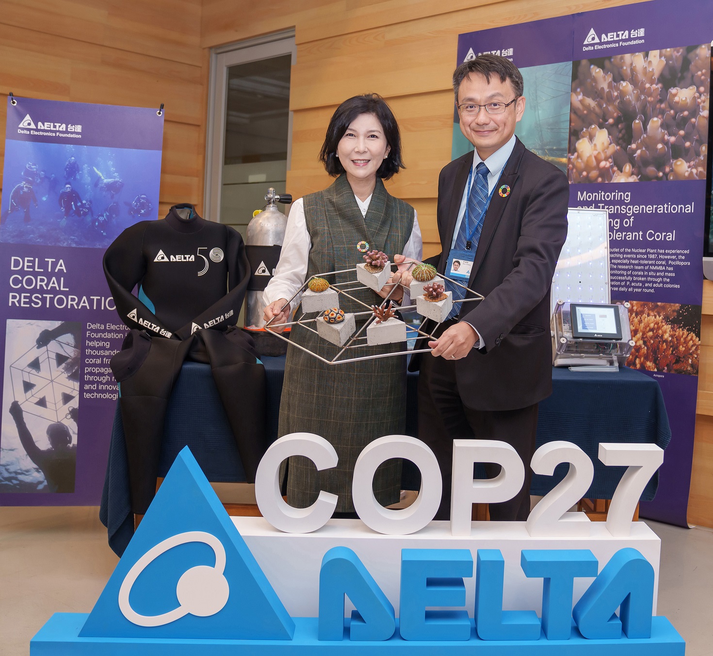 台達前進聯合國氣候會議COP27,將分享島嶼電網韌性及珊瑚復育雙議題,台達品牌長暨台達電子文教基金會副董事長郭珊珊(左)、台達基金會執行長張楊乾(右)於記者會展示珊瑚復育相關設備。
