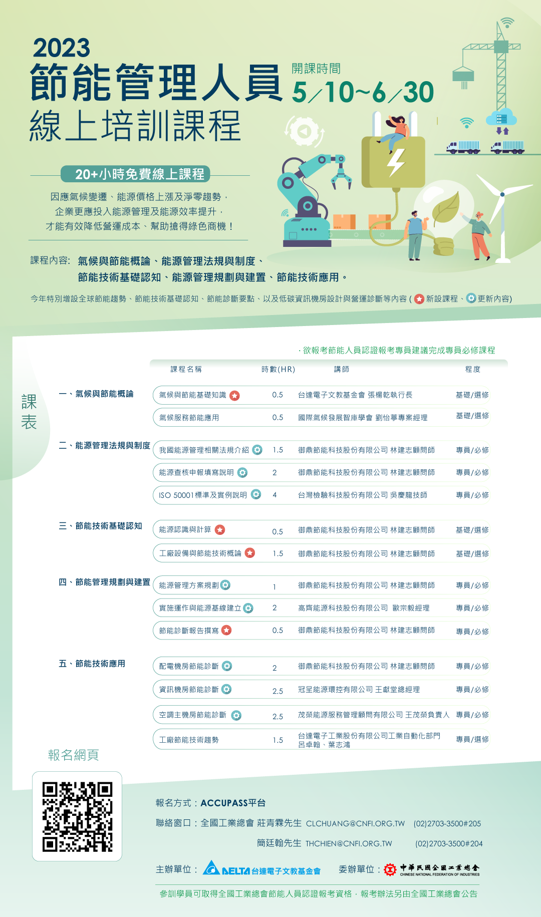 ▶課程內容: 氣候與節能概論、能源管理法規與制度、節能技術基礎認知、能源管理系統規畫與建置、節能技術應用